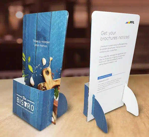 You could purchase a plastic brochure holder for your office or store. Or, you could extend your brochure design to the holder itself, creating one cohesive piece that tells a story. In this example, a custom brochure holder is made to match this restaurant’s to-go menus to keep that brand top-of-mind (even when the holder’s empty!)