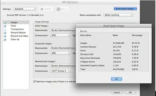To get to this command, in Acrobat 9 Pro, choose Advanced > PDF Optimizer. In Acrobat X Pro, choose File > Save As > Optimized PDF. In Acrobat XI Pro, choose File > Save as Other > Optimized PDF. This illustration shows the Audit Space Usage button has been clicked, and we can see that images are causing the large file size. By using the Downsampling command on the Images panel, you can choose an appropriate resolution. I chose 100 ppi. I brought the file size down to 4.67 Mb!